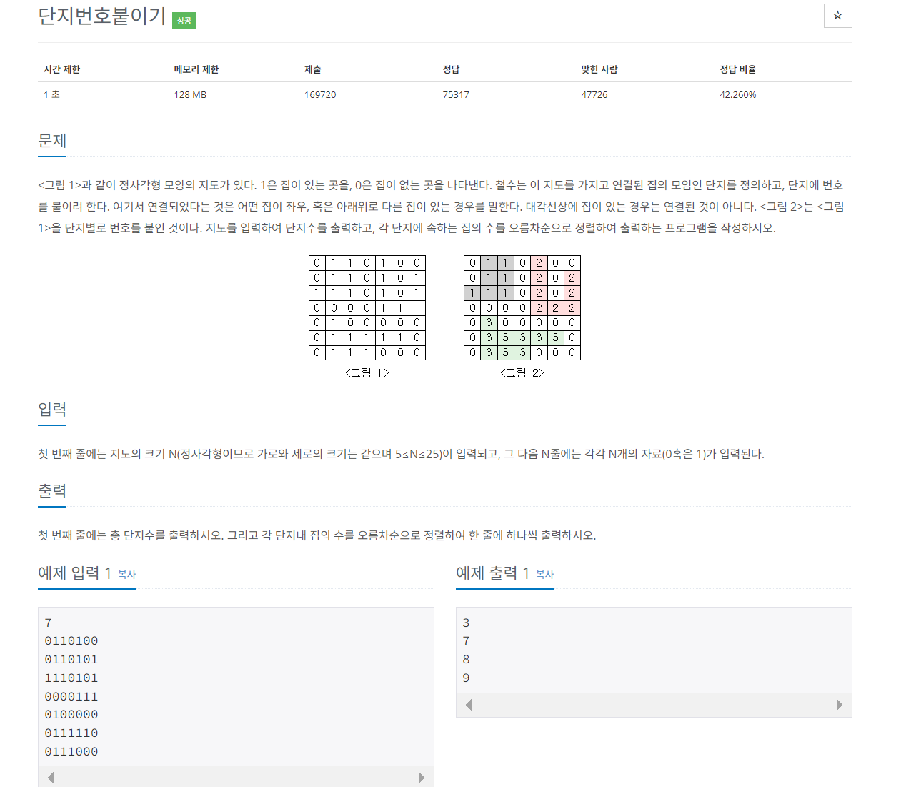 <그림 1>과 같이 정사각형 모양의 지도가 있다. 1은 집이 있는 곳을, 0은 집이 없는 곳을 나타낸다. 철수는 이 지도를 가지고 연결된 집의 모임인 단지를 정의하고, 단지에 번호를 붙이려 한다. 여
