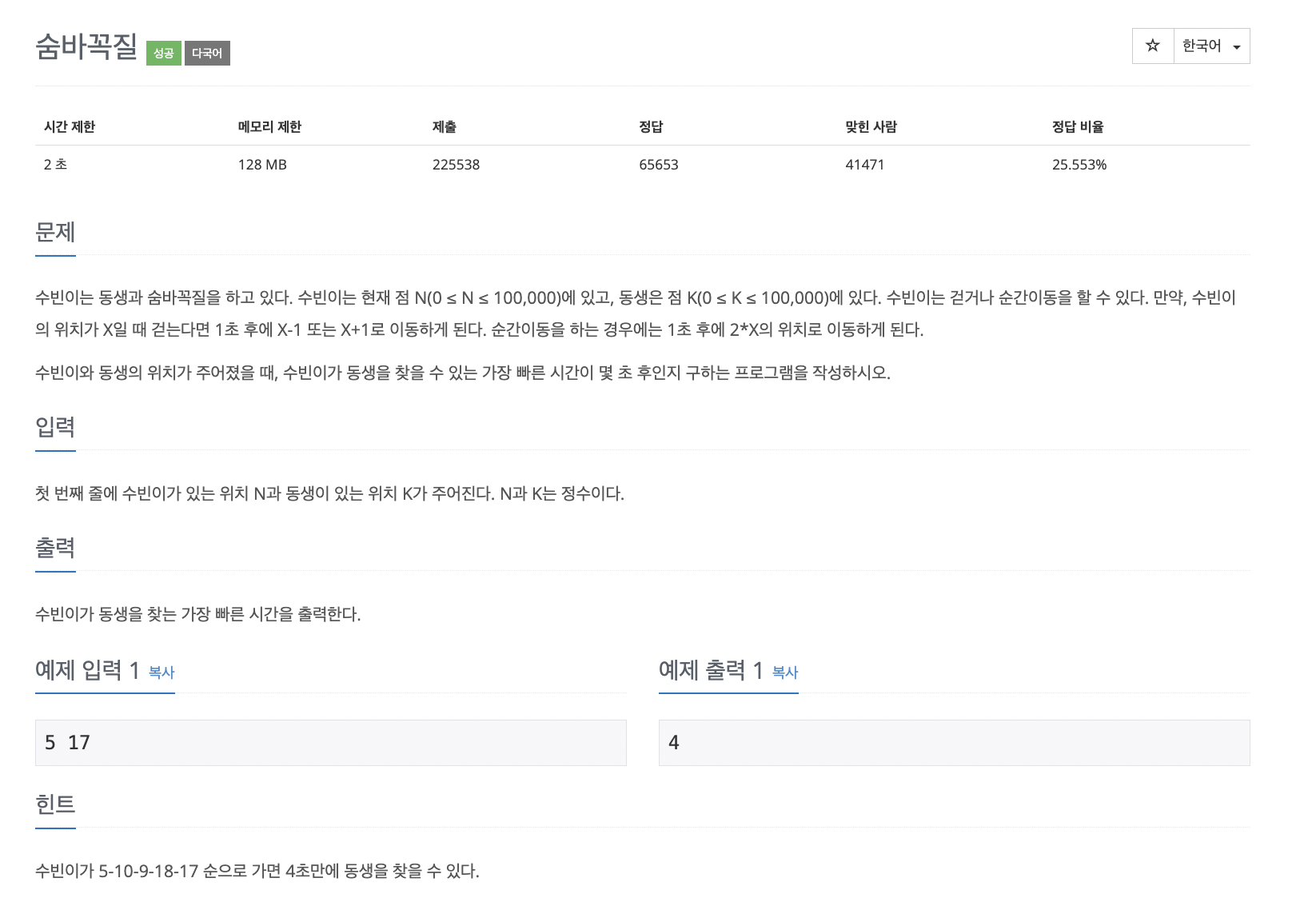 수빈이는 동생과 숨바꼭질을 하고 있다. 수빈이는 현재 점 N(0 ≤ N ≤ 100,000)에 있고, 동생은 점 K(0 ≤ K ≤ 100,000)에 있다. 수빈이는 걷거나 순간이동을 할 수 있다. 만약, 수빈이의 위치가 X일
