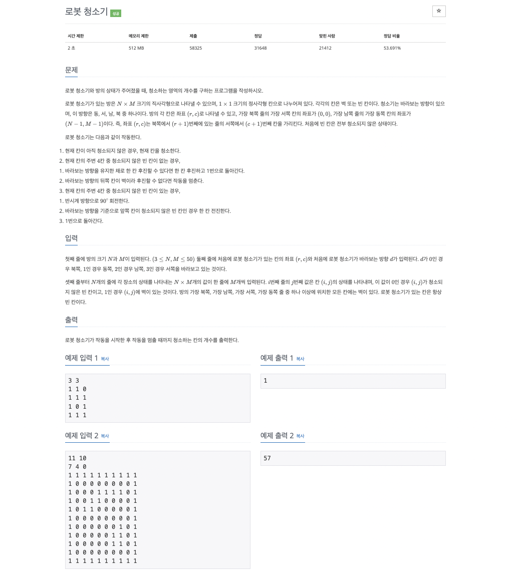 - 주변 4칸 중 청소할 칸이 있음 : 90도로 반시계방향으로 돌아서 청소해야하면 청소 (아니면 계속 돌기)