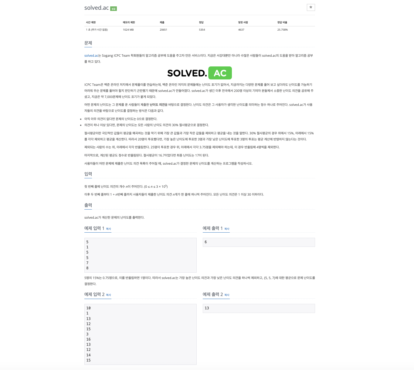 - 의견이 하나 이상 있다면, 문제의 난이도는 모든 사람의 난이도 의견의 30% 절사평균으로 결정한다.