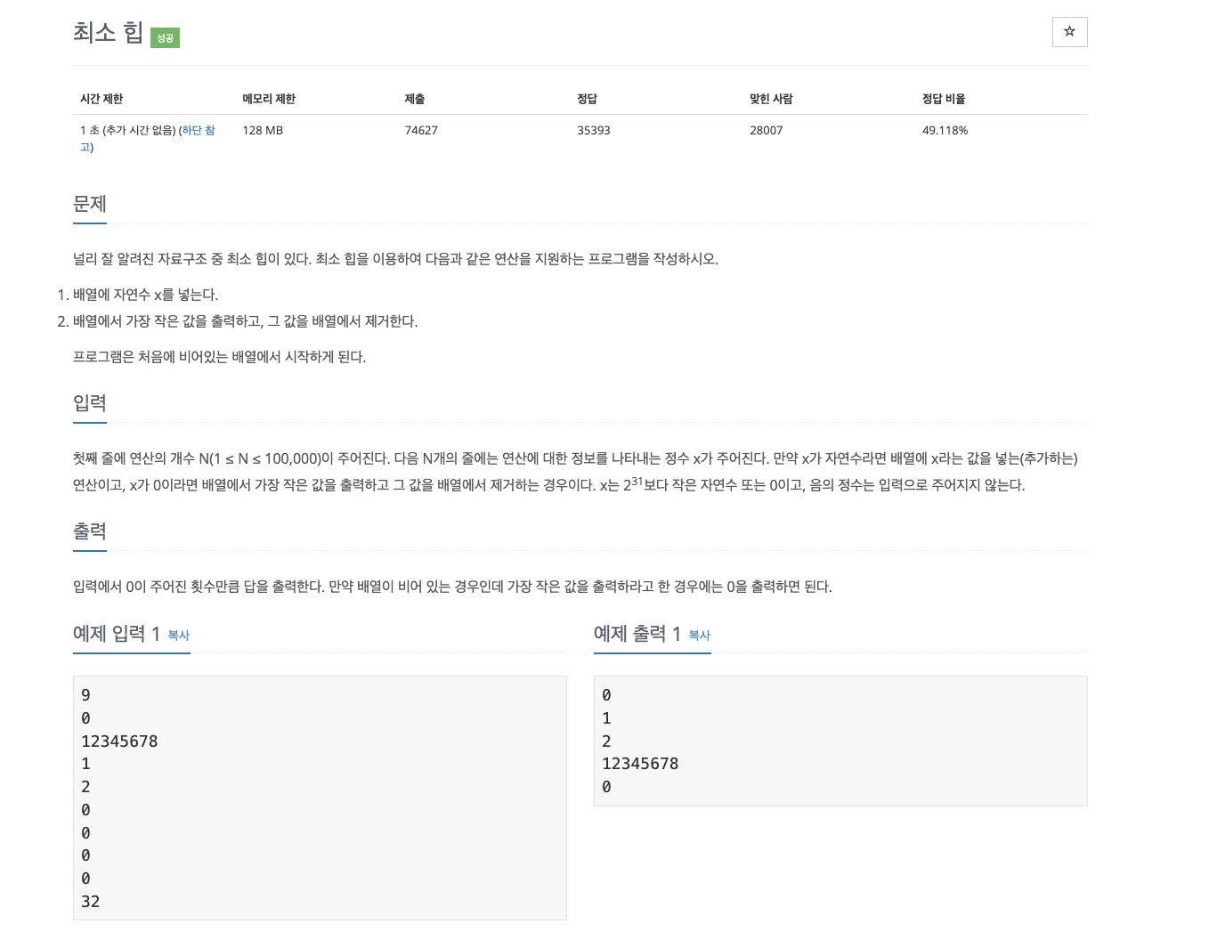 백준 1927번 문제 - 최소 힙