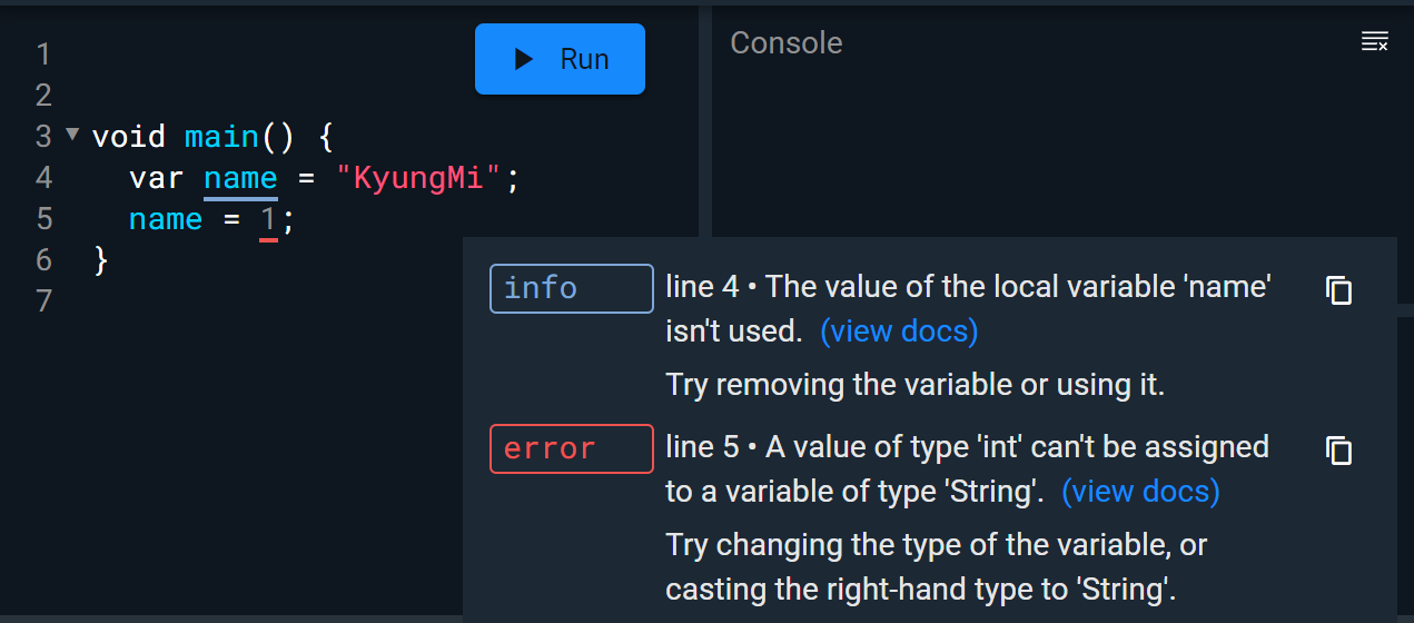 2. null safety가 생긴 dart 버전 : 컴파일 에러 발생 (아예 실행이 안됨)