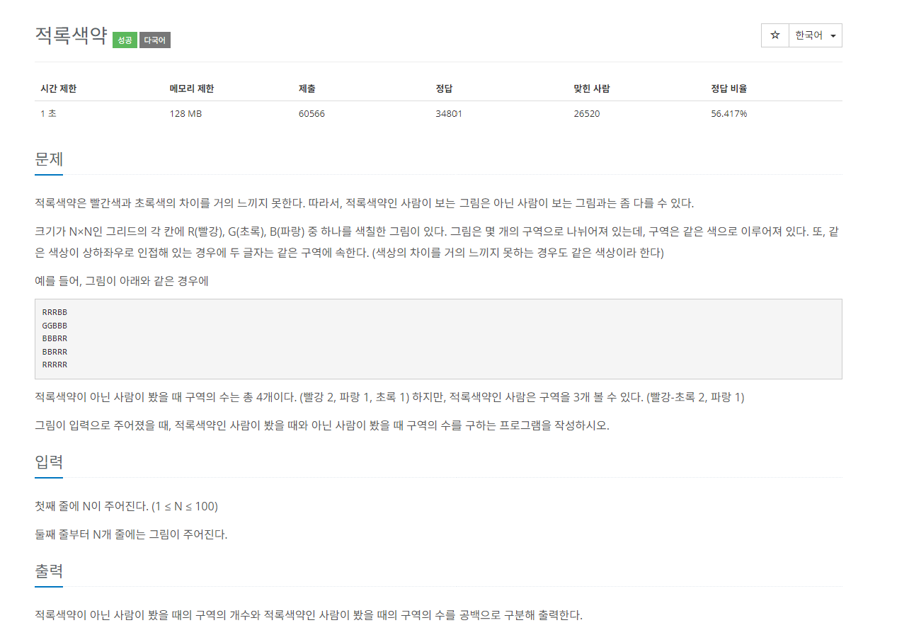 - 적록색약이 아닌 사람이 봤을 때 구역의 수와 적록색약(빨간 초록 구분 못함)이 봤을 때 구역 수를 출력해라.