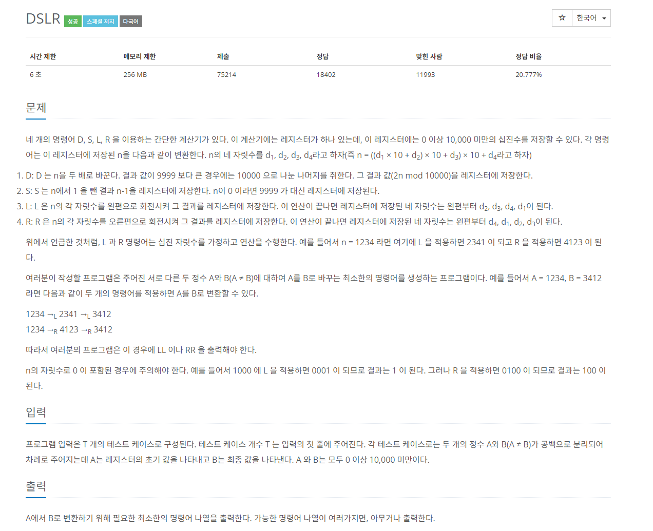 네 개의 명령어 D, S, L, R 을 이용하는 간단한 계산기가 있다. 이 계산기에는 레지스터가 하나 있는데, 이 레지스터에는 0 이상 10,000 미만의 십진수를 저장할 수 있다. 각 명령어는 이 레지스터에