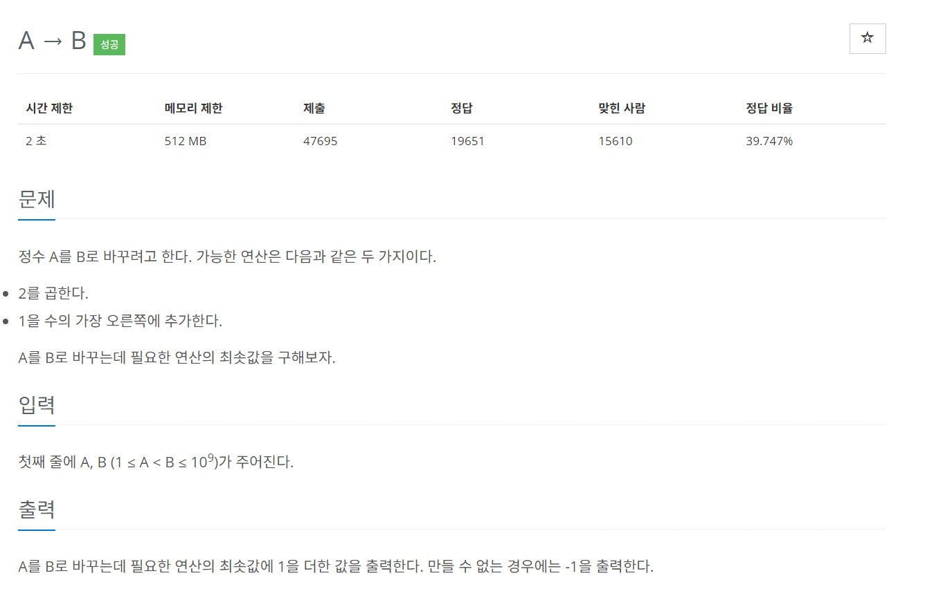 첫째 줄에 A, B (1 ≤ A < B ≤ 109)가 주어진다.