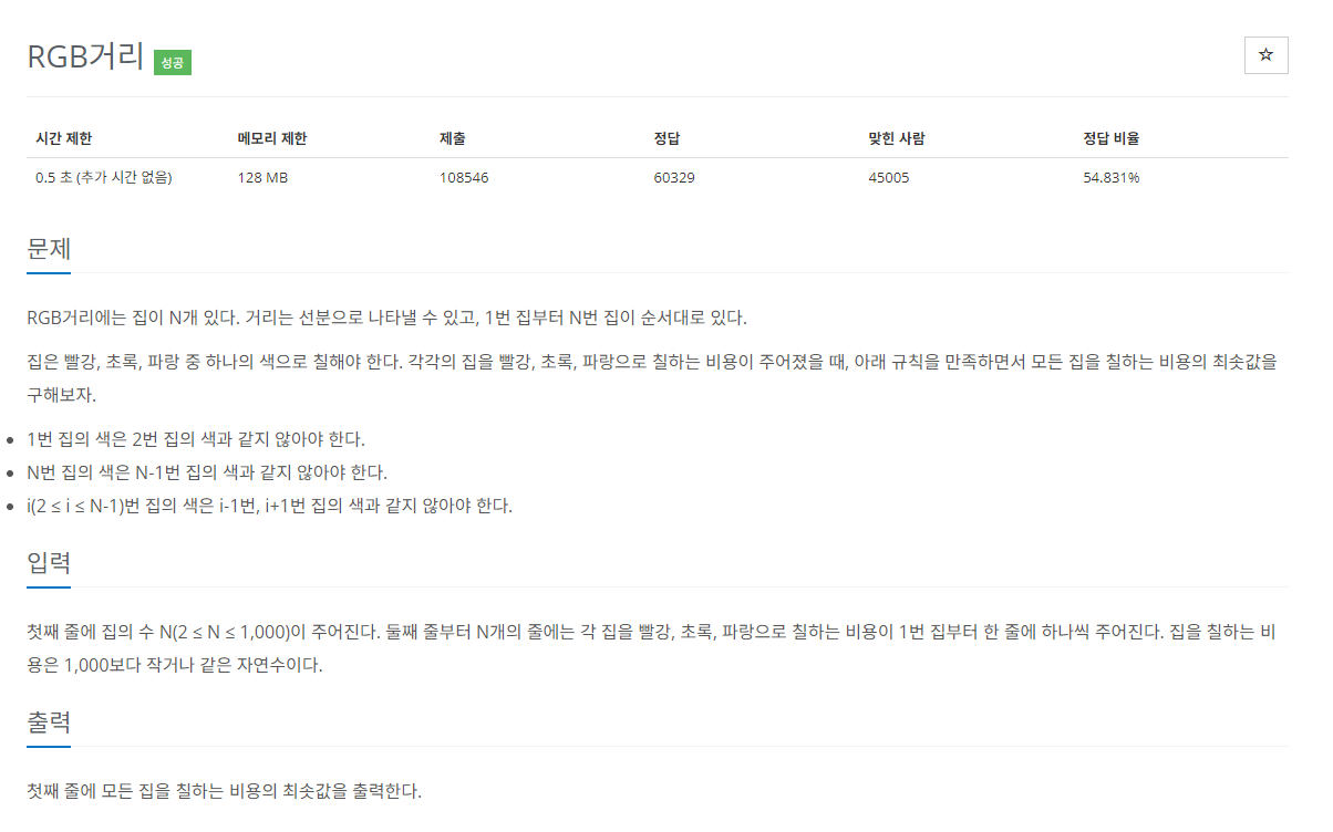 - b로 칠하려면, 이전 집이 r, g여야 한다. ≫ dp[i][2] = Math.min(dp[i-1][0], dp[i-1][1]) + b