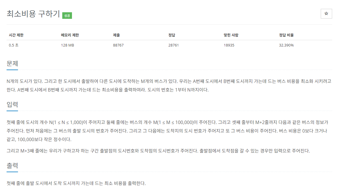 - 우리는 A번째 도시에서 B번째 도시까지 가는데 드는 버스 비용을 최소화 시키려고 한다.