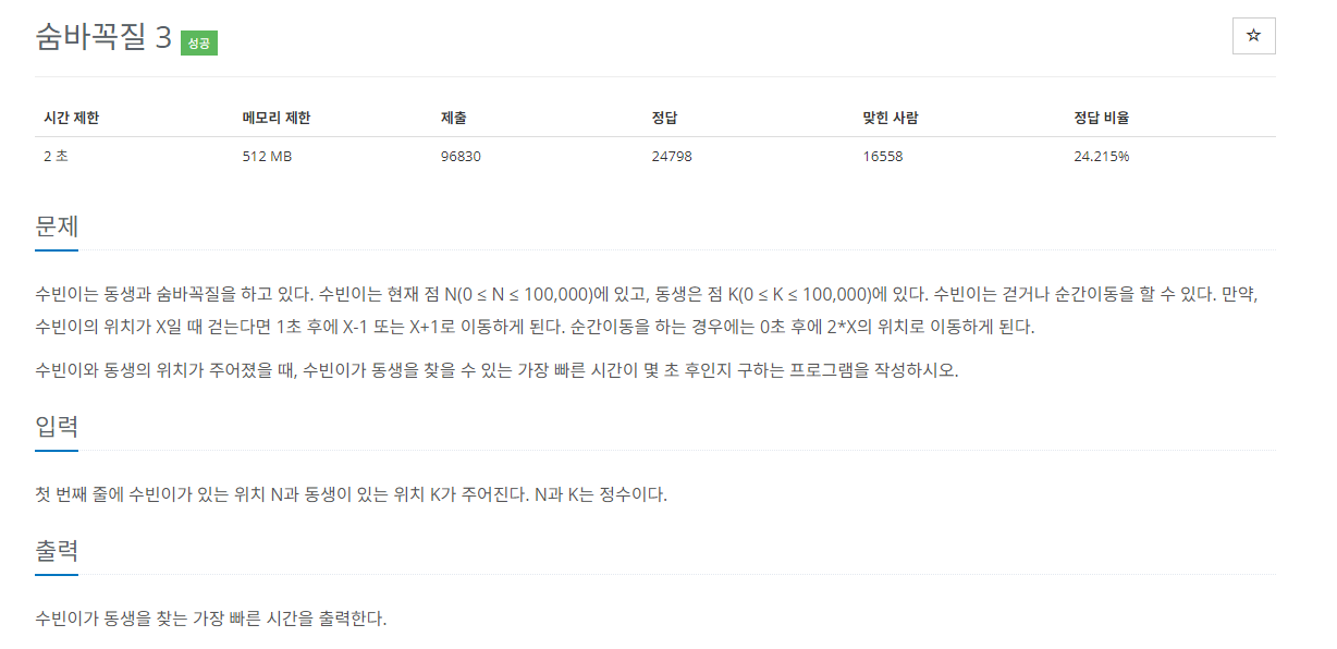 - 수빈이는 현재 점 N(0 ≤ N ≤ 100,000)에 있고, 동생은 점 K(0 ≤ K ≤ 100,000)에 있다