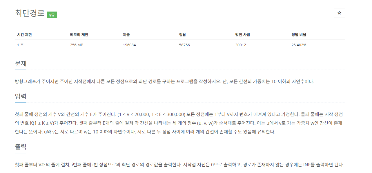 - 방향그래프가 주어지면 주어진 시작점에서 다른 모든 정점으로의 최단 경로를 구하는 프로그램을 작성하시오.