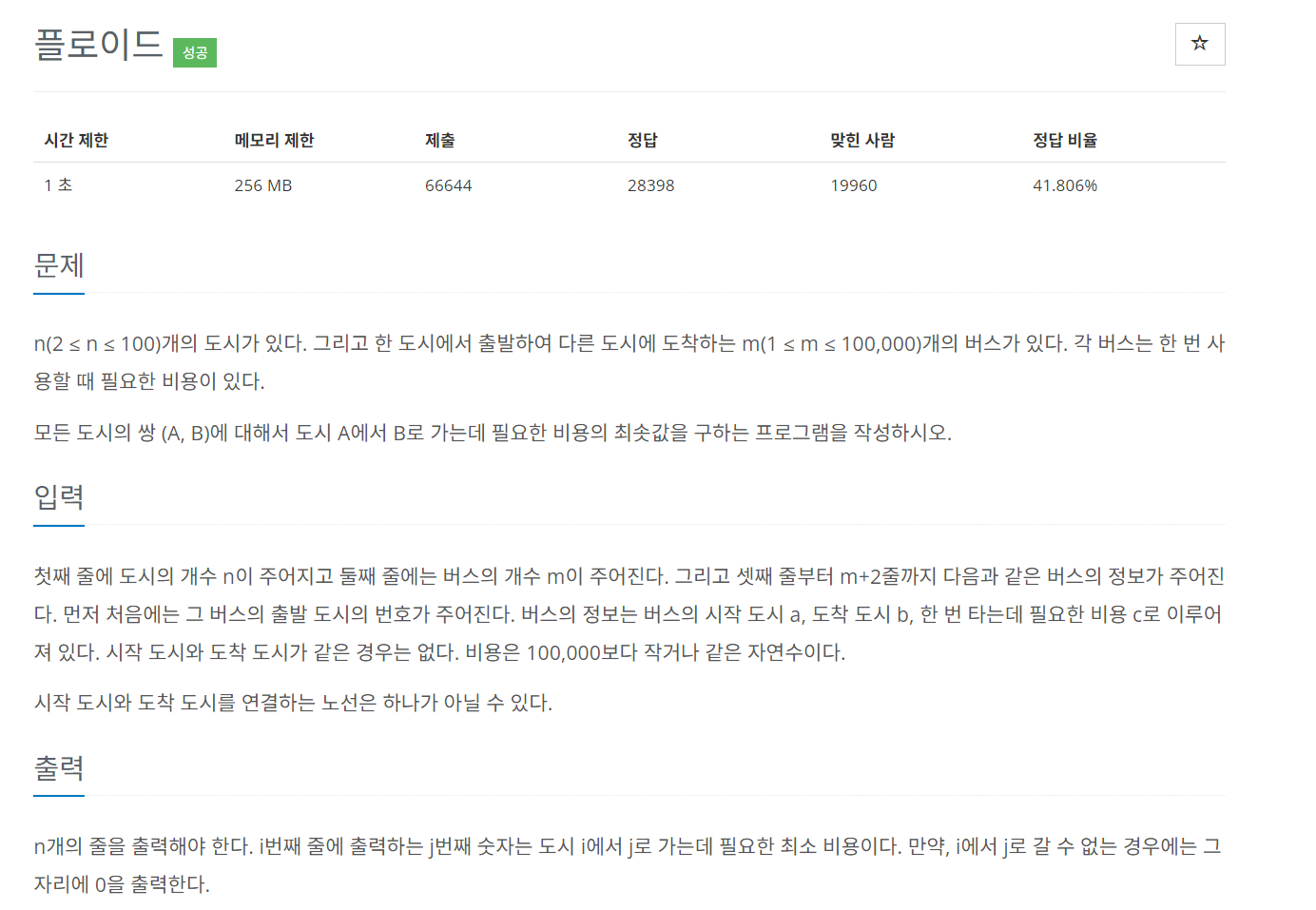 - 모든 도시의 쌍 (A, B)에 대해서 도시 A에서 B로 가는데 필요한 비용의 최솟값을 구하는 프로그램을 작성