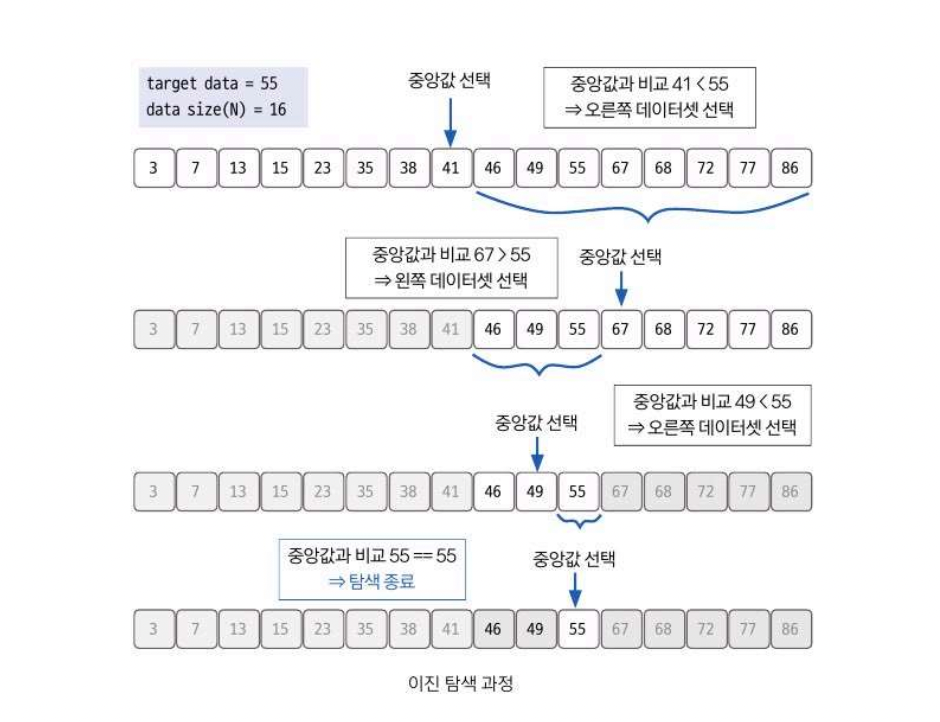 중앙값 < 타깃 데이터 일 때 : 중앙 값 기준으로 오른쪽 데이터 셋 선택 - 과정 1~2를 반복하다, 중앙값 == 타깃 데이터 일 때 : 탐색 종료