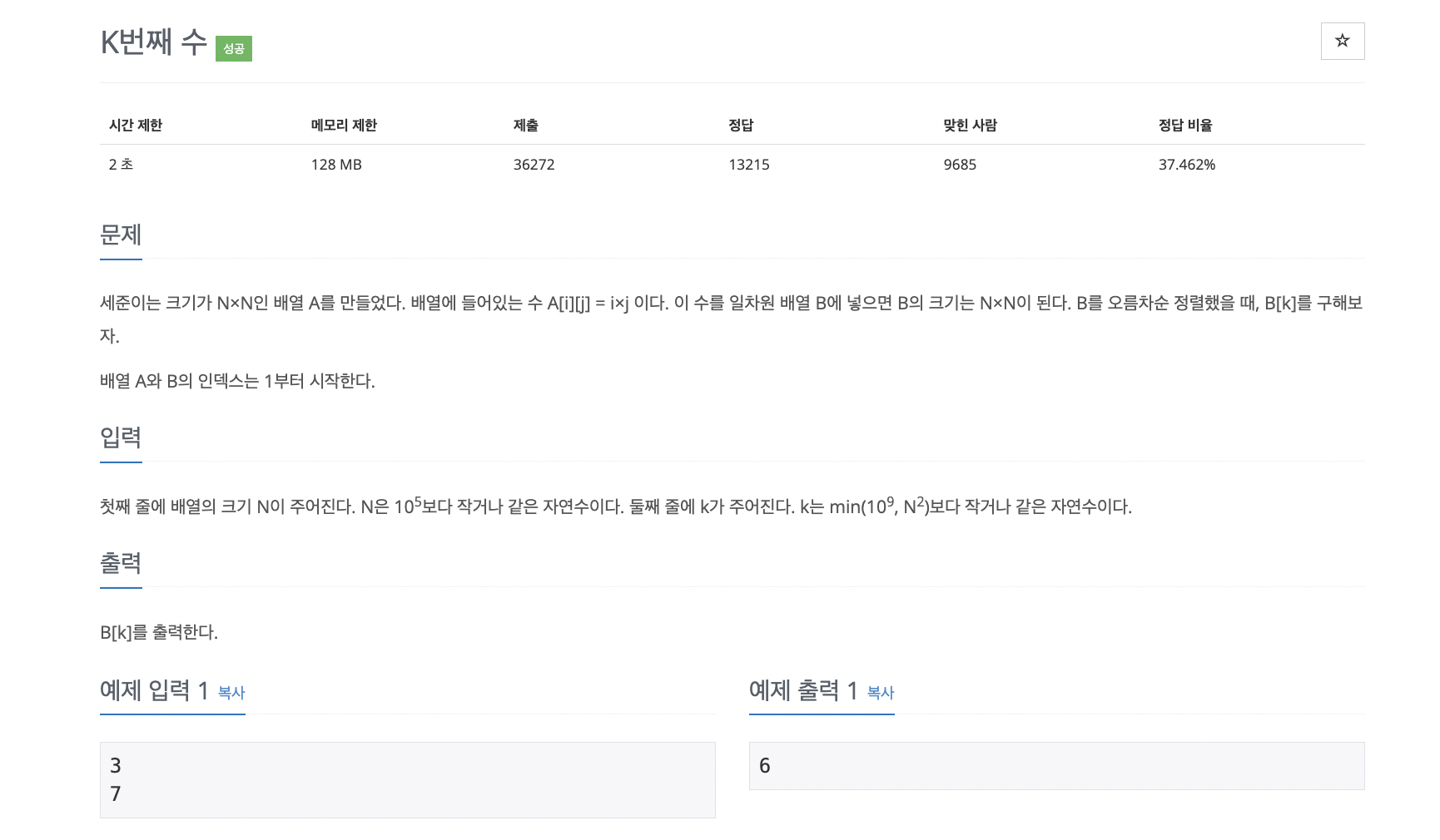 세준이는 크기가 N×N인 배열 A를 만들었다. 배열에 들어있는 수 A[i][j] = i×j 이다. 이 수를 일차원 배열 B에 넣으면 B의 크기는 N×N이 된다. B를 오름차순 정렬했을 때, B[k]를 구해보자. 배열 A와 B