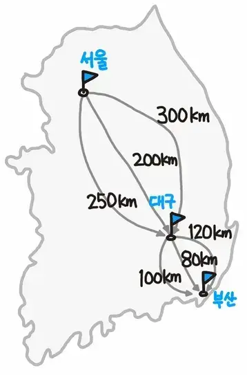 뒤에 사진에서 서울에서 부산까지의 최소거리를 구하고자할 때,