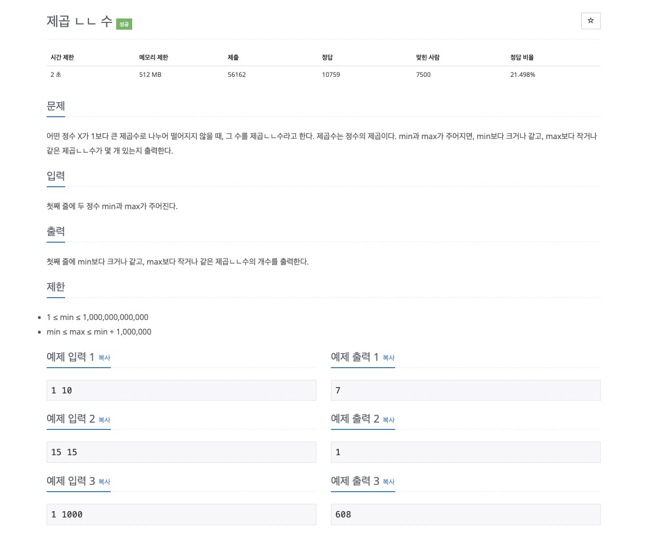 - 제약 조건 : 1 ≤ min ≤ 1,000,000,000,000 | min ≤ max ≤ min + 1,000,000