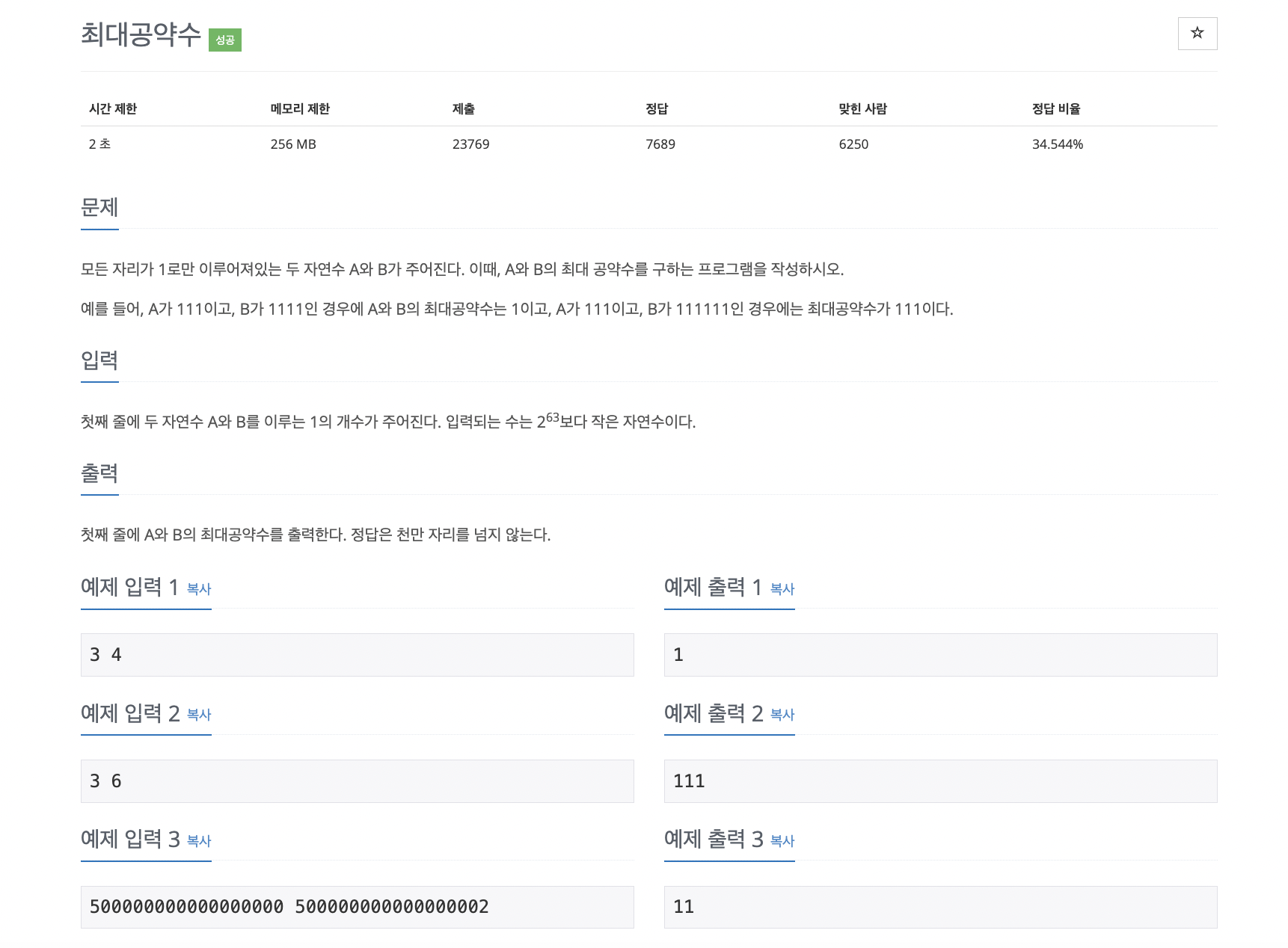 모든 자리가 1로만 이루어져있는 두 자연수 A와 B가 주어진다. 이때, A와 B의 최대 공약수를 구하는 프로그램을 작성하시오. 예를 들어, A가 111이고, B가 1111인 경우에 A와 B의 최대공약수는 1이고, A