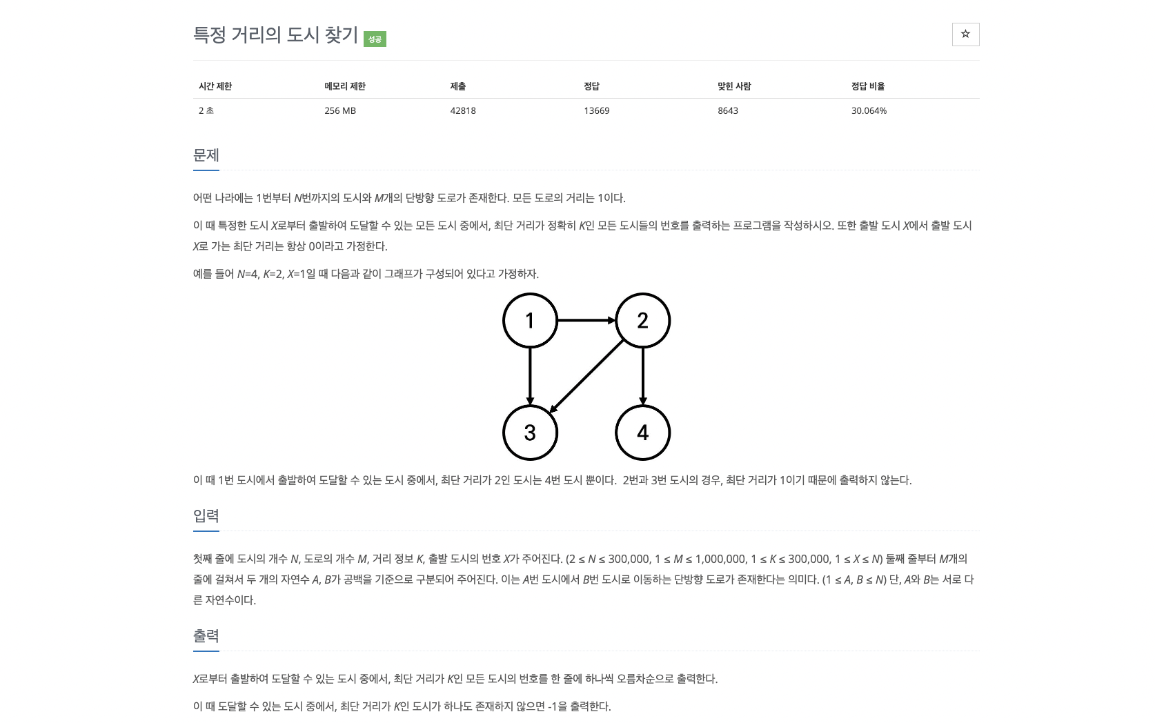 - 이를 토대로, X에서 출발했을 때 어떤 도시까지 갈 때 최단 거리가 K번인 도시들을 출력해라 (오름차순으로)