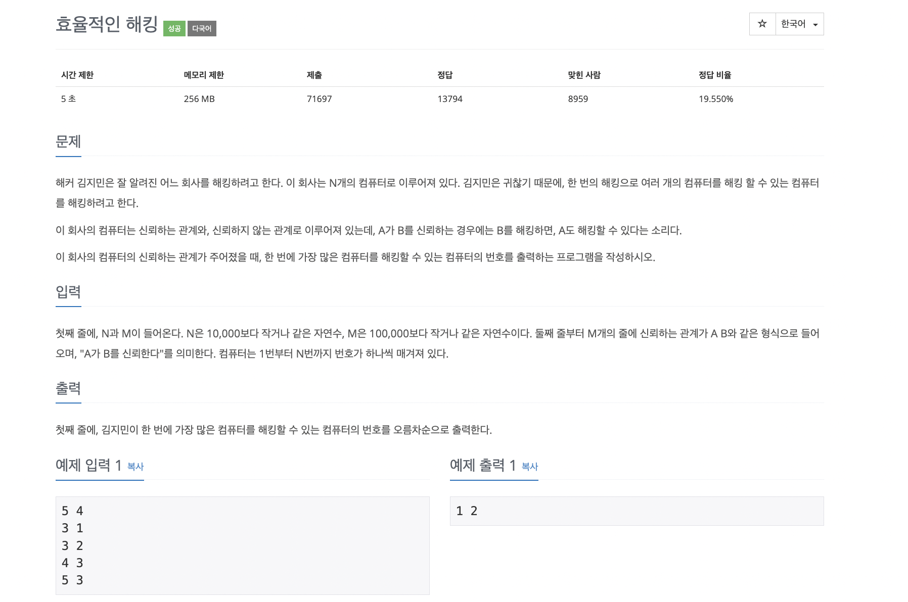첫째 줄에, N과 M이 들어온다. N은 10,000보다 작거나 같은 자연수, M은 100,000보다 작거나 같은 자연수이다. 둘째 줄부터 M개의 줄에 신뢰하는 관계가 A B와 같은 형식으로 들어오며, "A가 B를 신뢰한