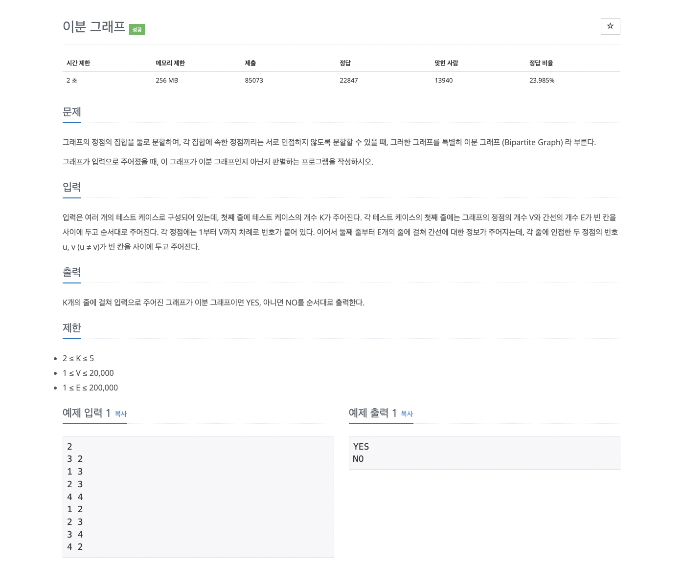 - 몇 번 동작할지(K) 입력 → 정점(V), 간선(E) 입력 → 간선 입력 → 이분 그래프가 가능하면 YES, 아니면 NO 출력