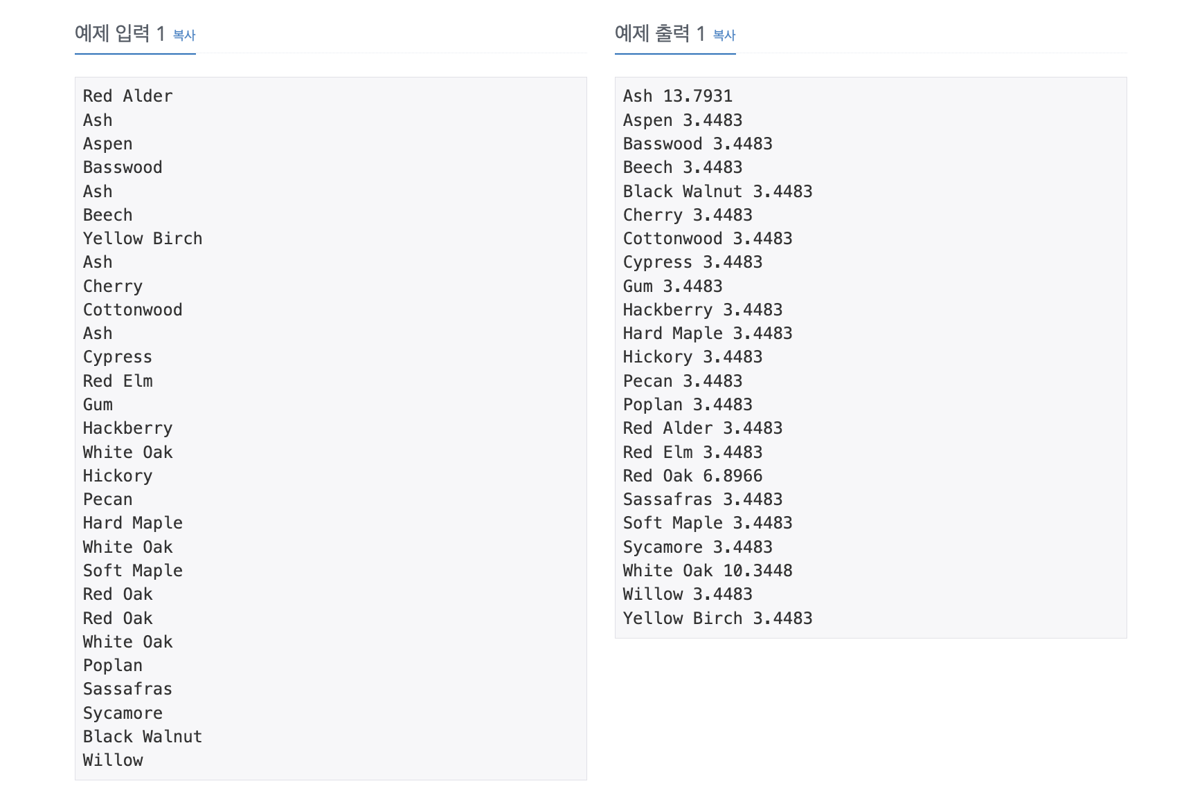프로그램은 여러 줄로 이루어져 있으며, 한 줄에 하나의 나무 종 이름이 주어진다. 어떤 종 이름도 30글자를 넘지 않으며, 입력에는 최대 10,000개의 종이 주어지고 최대 1,000,000그루의 나무가 주어