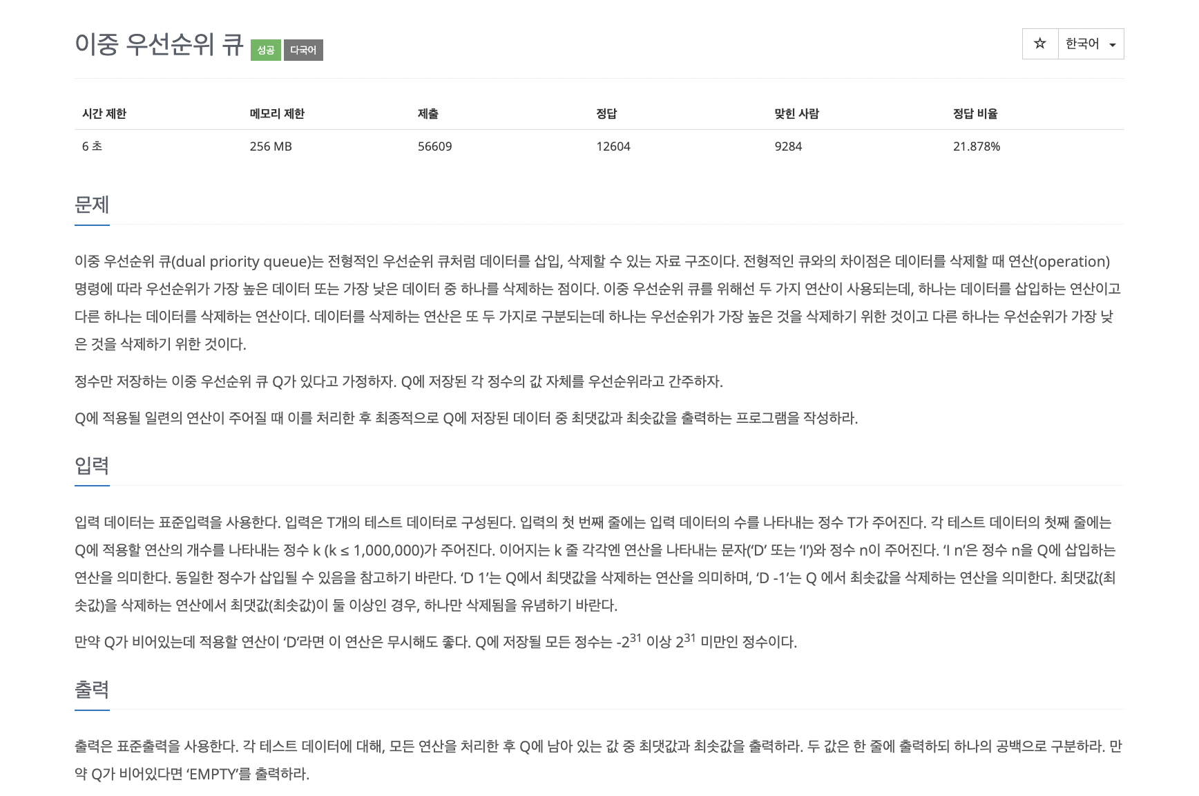 - 입력 받을 테스트 개수를 입력받고, 각 케스트에서 연산 수를 입력 받는다. 그리고 연산을 실행하고 가장 큰 값, 가장 작은 값을 출력한다. (이중 우선순위 큐의 첫번째와 마지막 값을 출력) 만약 값이 없으면 EMPTY를 출력하라.
