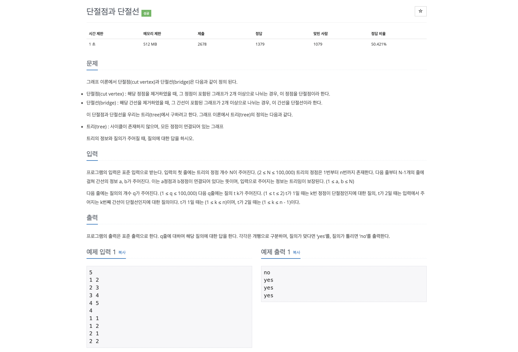 - 단절선인가(2 k) : 문제 조건이 사이클이 존재하지 않고 모든 정점이 연결된 트리이므로 간선은 무조건적으로 단절선으로 yes