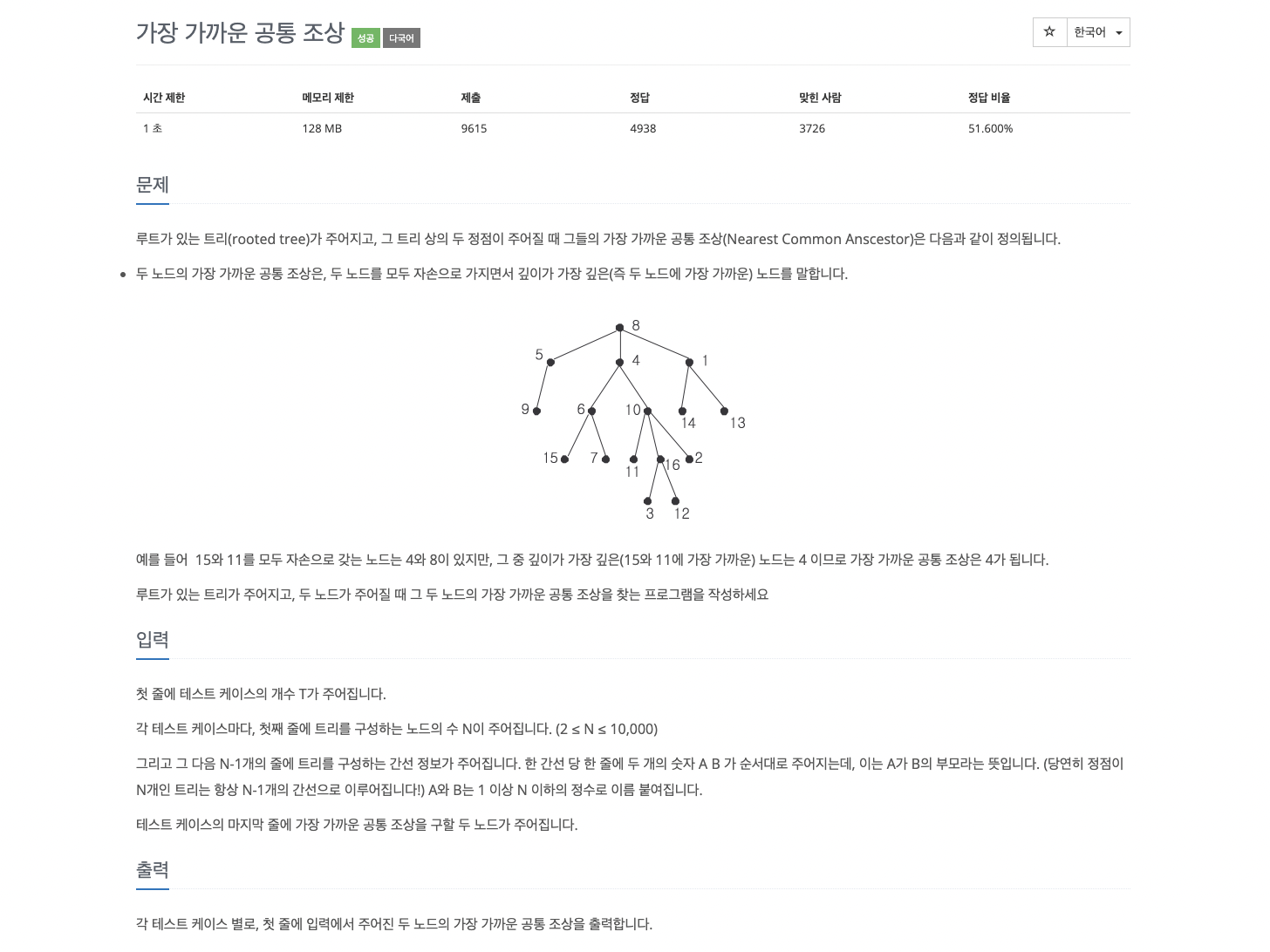 루트가 있는 트리(rooted tree)가 주어지고, 그 트리 상의 두 정점이 주어질 때 그들의 가장 가까운 공통 조상(Nearest Common Anscestor)은 다음과 같이 정의됩니다. 두 노드의 가장 가까운 공통 조상은, 두