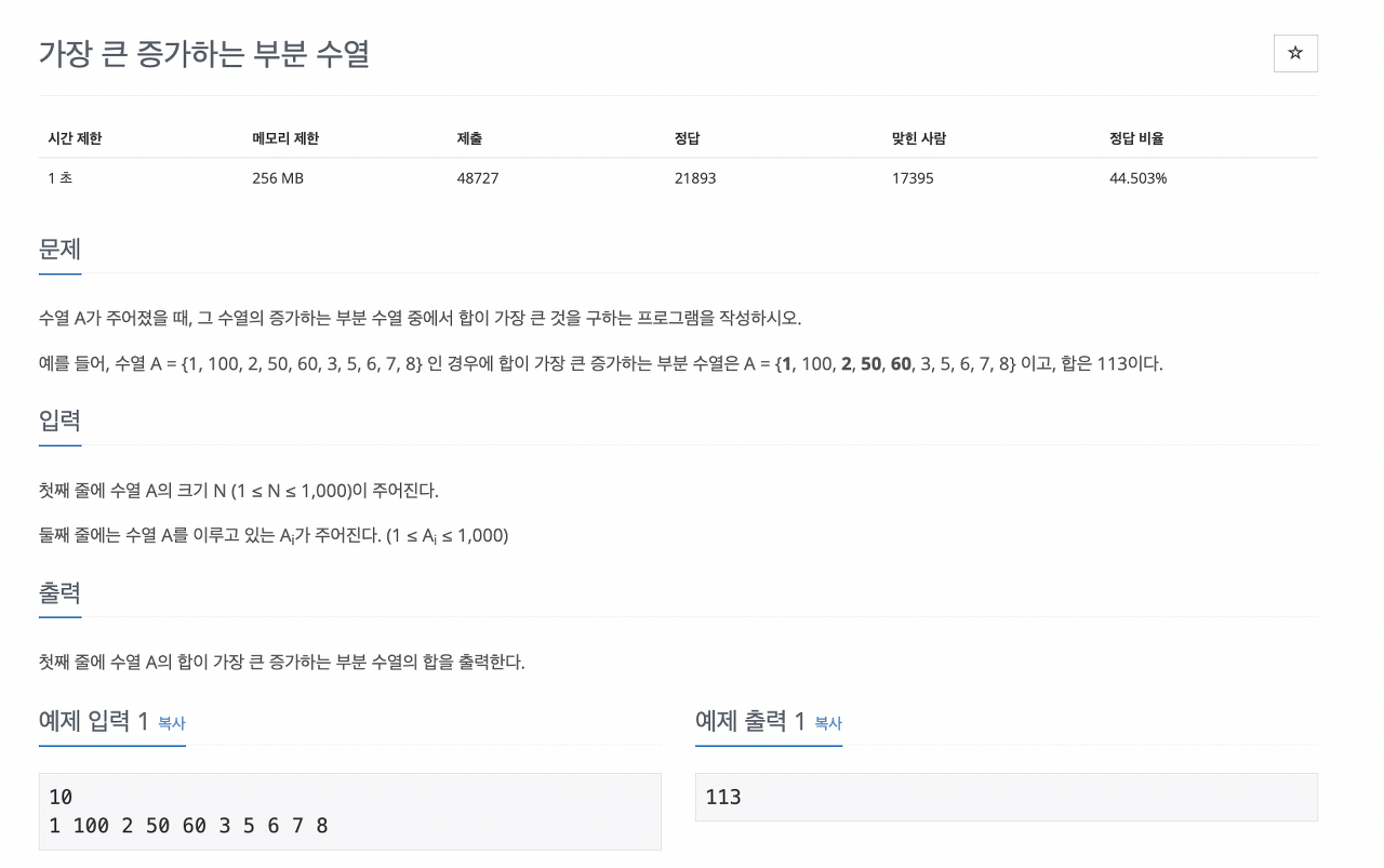 수열 A가 주어졌을 때, 그 수열의 증가하는 부분 수열 중에서 합이 가장 큰 것을 구하는 프로그램을 작성하시오. 예를 들어, 수열 A = {1, 100, 2, 50, 60, 3, 5, 6, 7, 8} 인 경우에 합이 가장 큰 증가하는