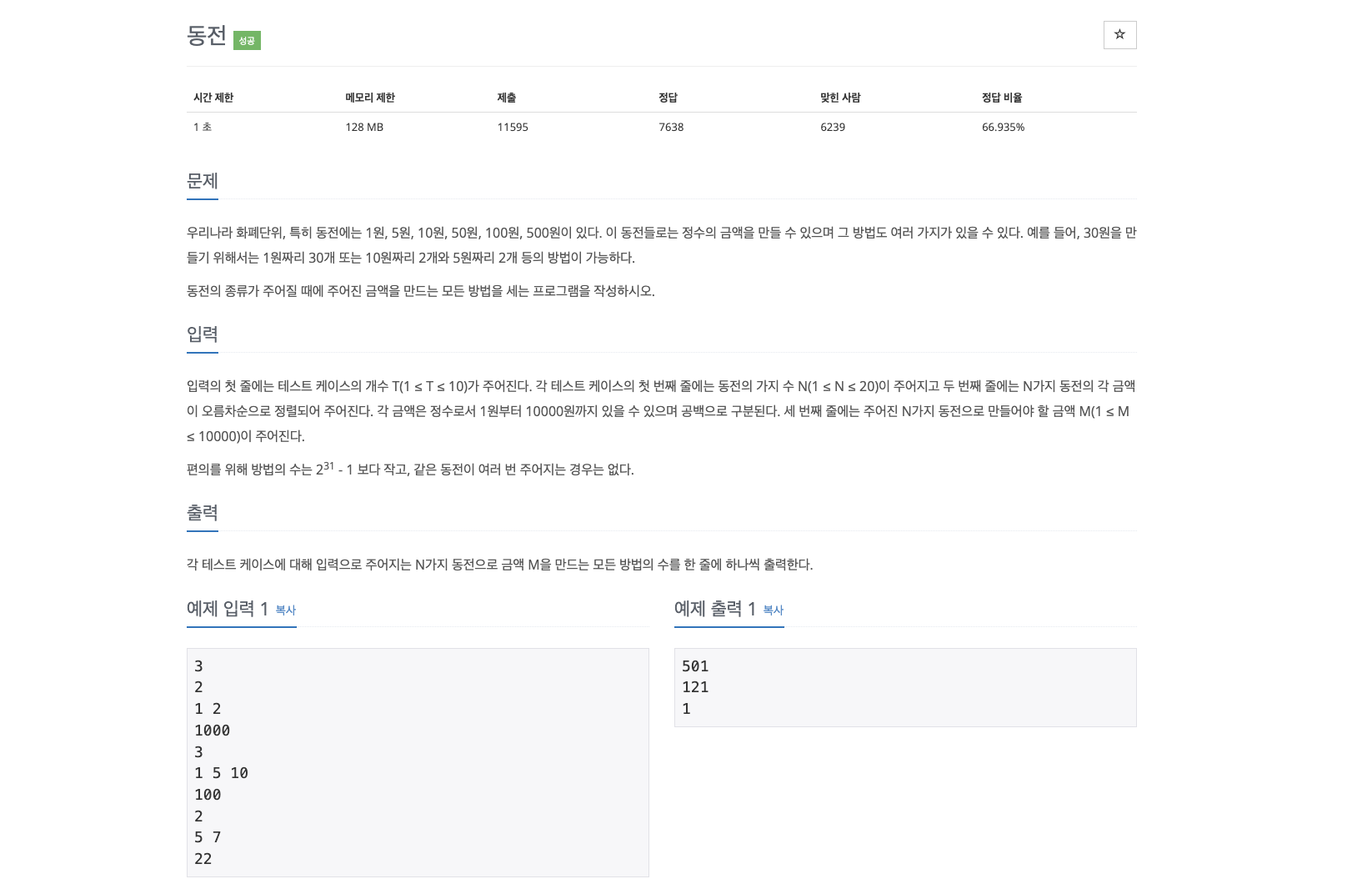- 가지고 있는 동전 종류를 통해 해당 값을 계산할 수 있는 모든 방법의 수를 출력하라