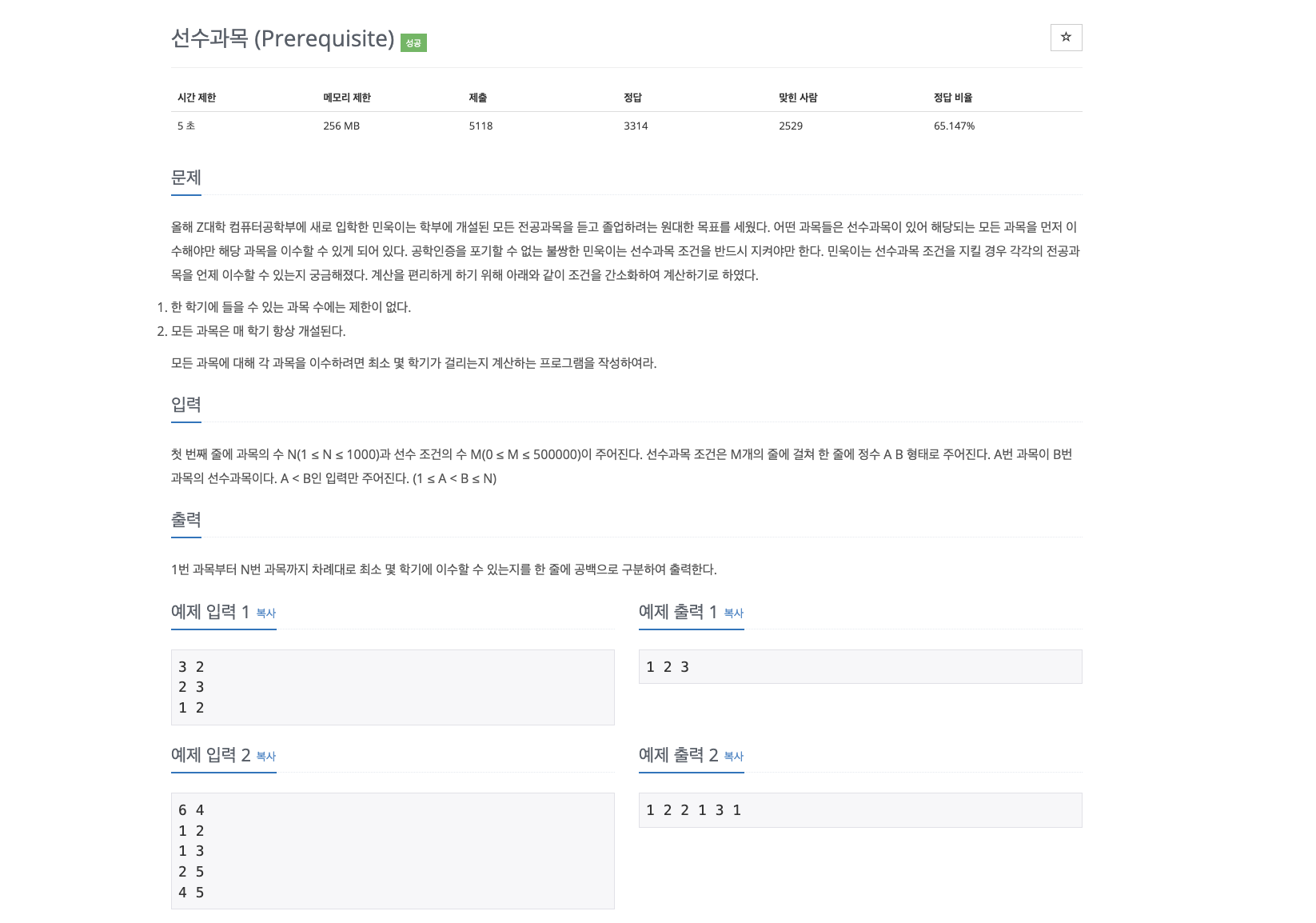 - " A번 과목이 B번 과목의 선수과목이다. A < B인 입력만 주어진다. "