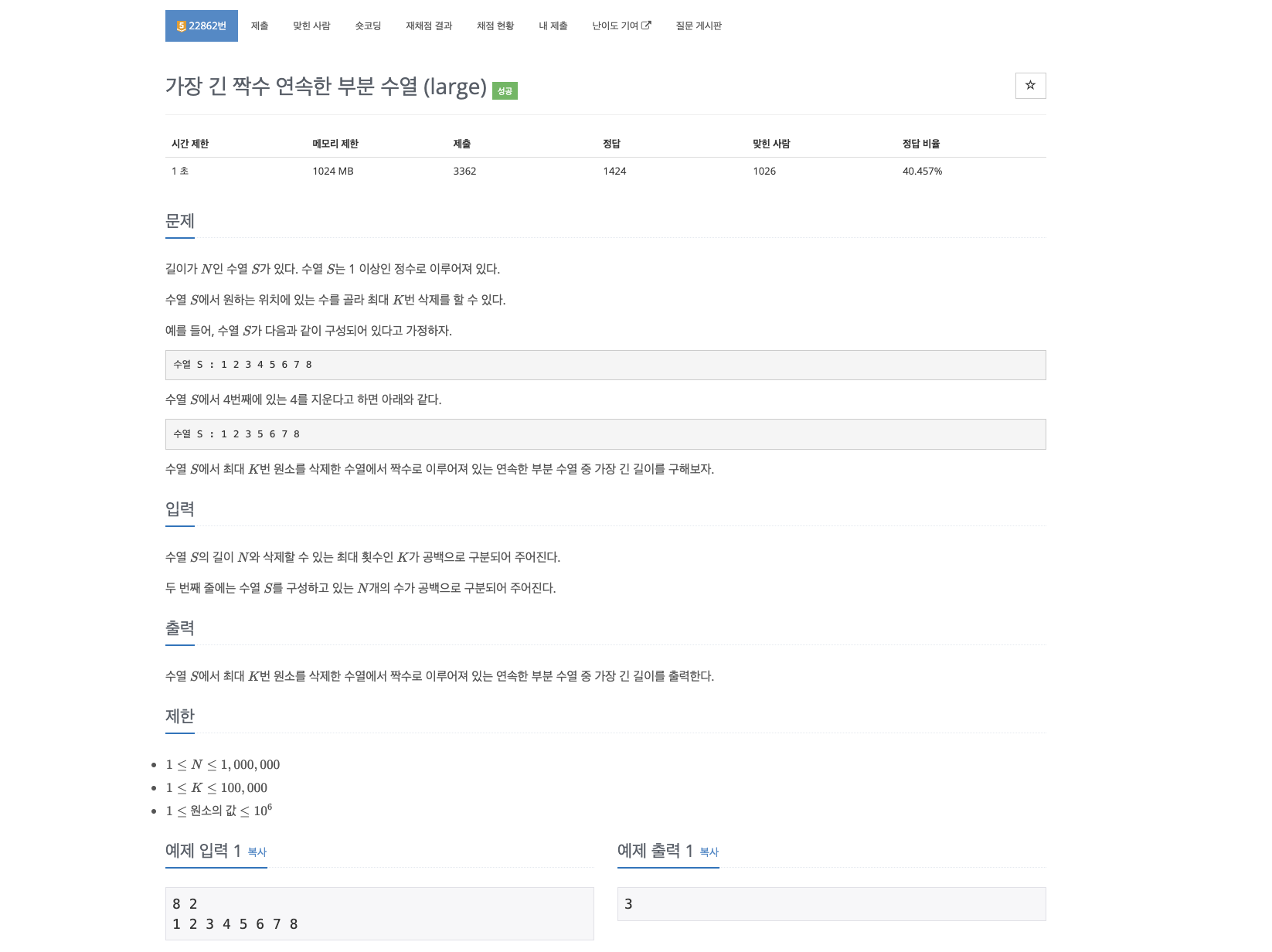 수열 $S$에서 최대 $K$번 원소를 삭제한 수열에서 짝수로 이루어져 있는 연속한 부분 수열 중 가장 긴 길이를 출력한다.